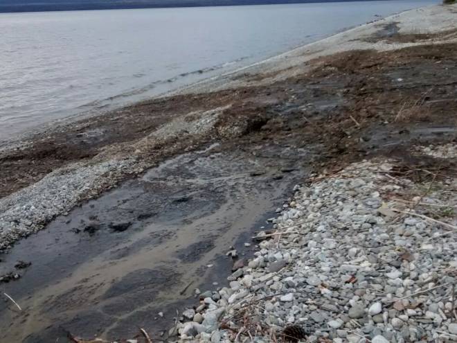 Un pesistente olor nauseabundo en la costa del lago Nahuel Huapi y un visible derrame de líquidos oscuros dan cuenta de una pérdida de residuos cloacales crudos en una cañería cuyo extremo se encuentra ubicado a pocos metros de la orilla del lago.