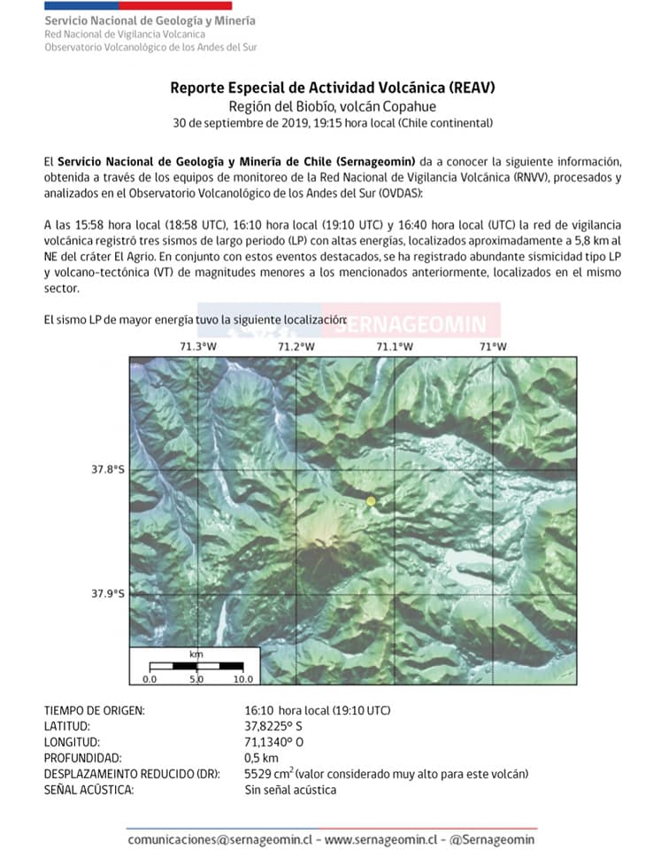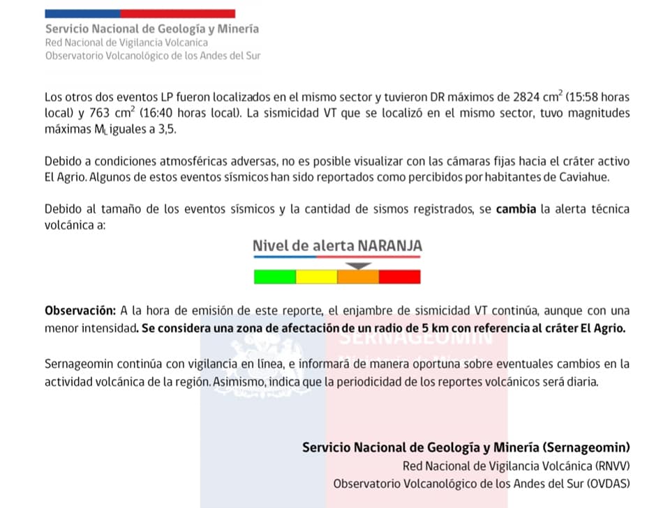 La red de vigilancia volcánica registro esta tarde sismos de LP con altas energías y abundante sismicidad. Por esto el Sernageomin (Chile) junto al Segemar (Argentina) y la Subsecretaria de Defensa Civil (Neuquén, Argentina) informan sobre el incremento de alerta técnica naranja lo que implica un radio de exclusión de 5 km en torno al cráter.