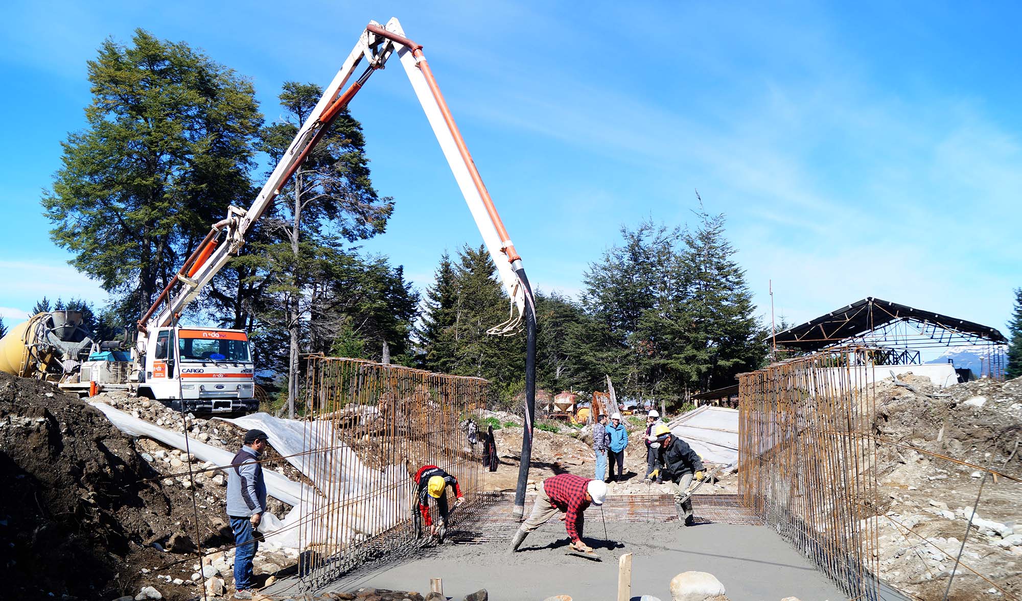 Personal contratado por la empresa constructora que realiza la urbanización del loteo social trabaja en el llenado de hormigón de la estructura del puente.