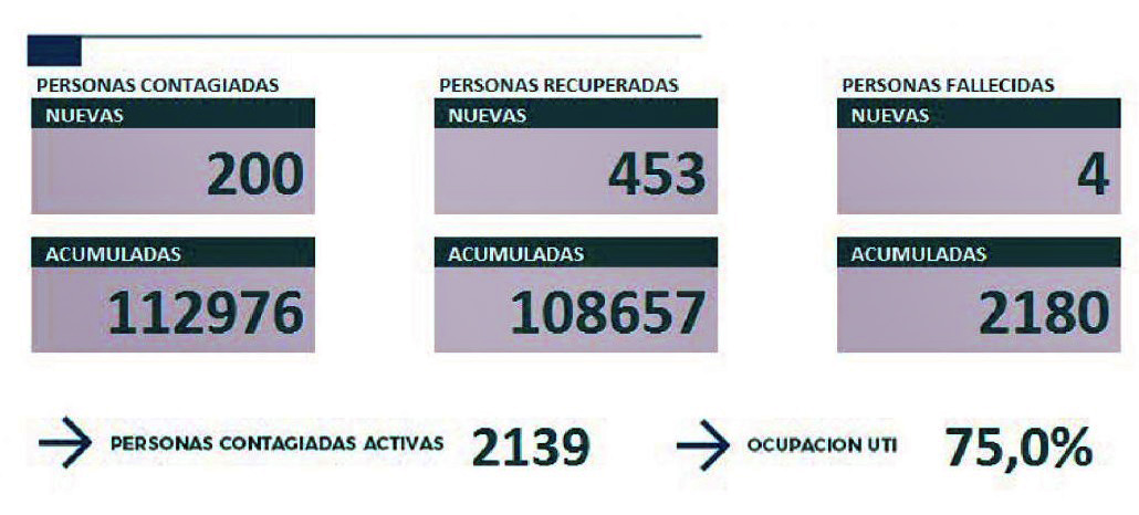En las últimas 24 horas se confirmaron 200 nuevos contagios, aunque 453 personas fueron dadas de alta, mientras que 4 fallecieron siendo 2.180 las víctimas por este virus desde que se inició la pandemia en marzo del año pasado.