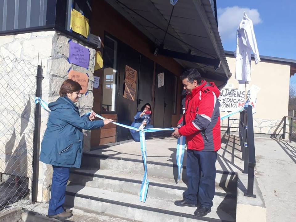 Durante el acto por el 86º aniversario de Villa la Angostura un grupo de docentes se presentó con pancartas reclamando por un nuevo edificio para la Escuela 361, además de la solución para este conflicto que no vislumbra una solución a corto plazo.