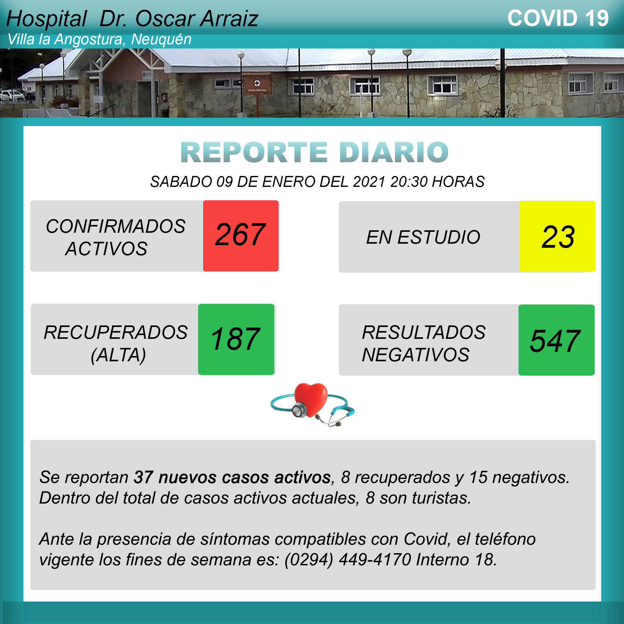 El hospital Dr. Oscar Arraiz informó este sàbado por la noche (20:35 hs) de 37 nuevos contagios en Villa la Angostura, de los cuales 8 son turistas.