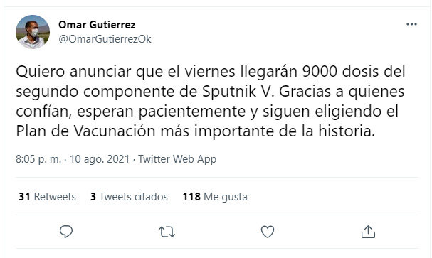 "Quiero anunciar que el viernes llegarán 9000 dosis del segundo componente de Sputnik V. Gracias a quienes confían, esperan pacientemente y siguen eligiendo el Plan de Vacunación más importante de la historia", sostuvo en el posteo publicado este martes por la noche.