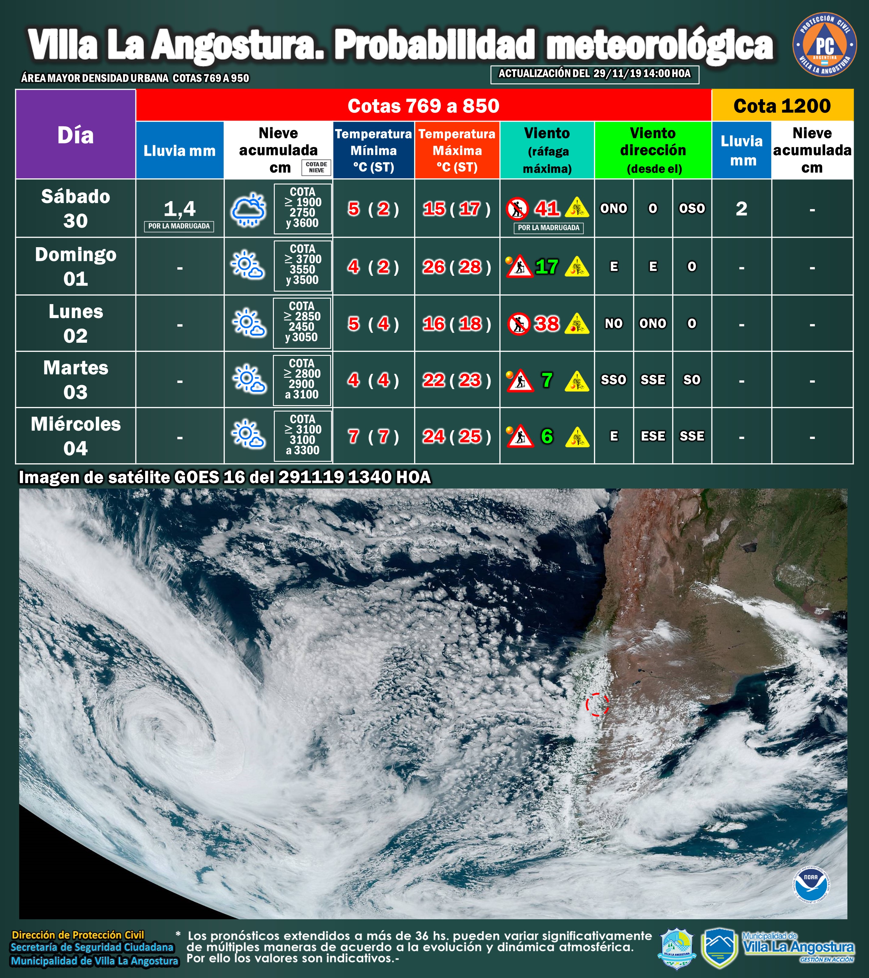 A partir de este sábado comienza a mejorar el clima, con temperaturas más altas y sin lluvias. Pronóstico de Protección Civil Villa la Angostura.