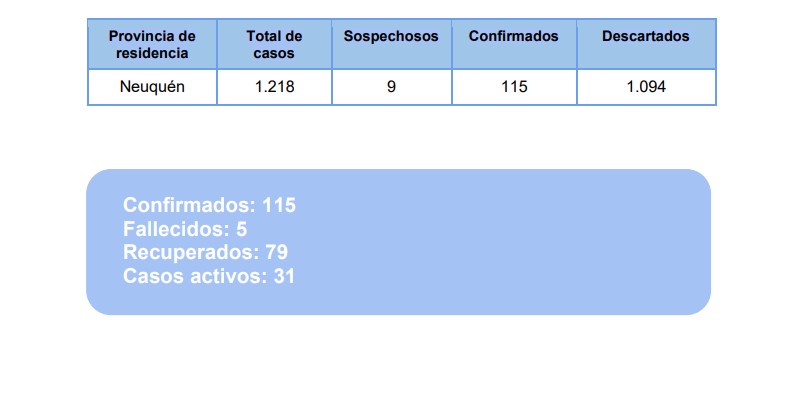 Además, se descartaron 17 casos sospechosos de la provincia del Neuquén. No se confirmaron nuevos casos.