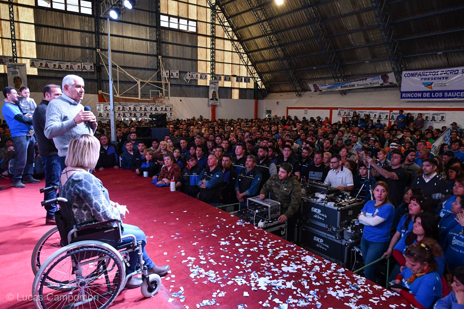 “Hay que trabajar para que esto continúe, por la dignidad de la familia rinconense. No nos caigamos por la crisis, porque sabemos cómo salir. Salimos todos juntos tirando para el mismo lado”, arengó el senador frente a una multitud que colmó el gimnasio municipal.