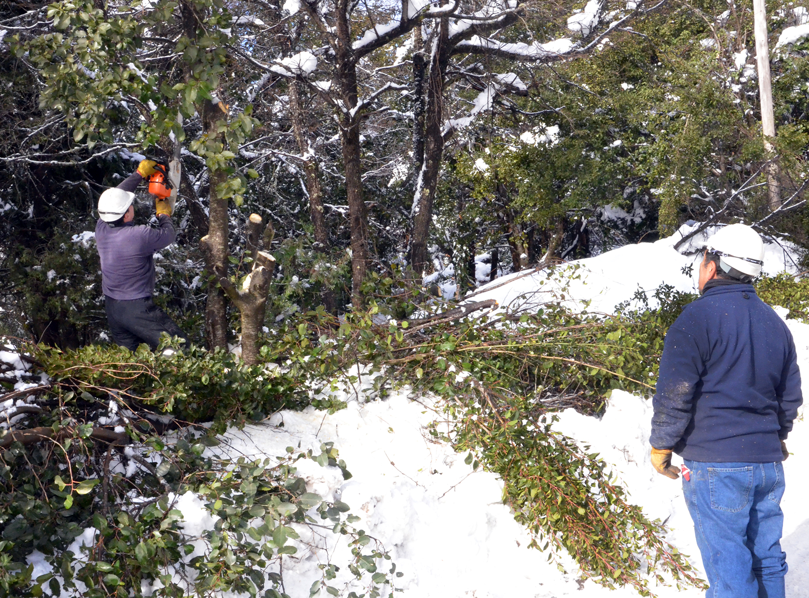 Las brigadas de incendios forestales, de Villa La Angostura sumado a San Martin y Junín de los Andes resolvieron el retiro de árboles caídos en Cruz del Sur, Camino del Conde, Virgen de la Asunción, Quetrihue y Cacique Antriao.