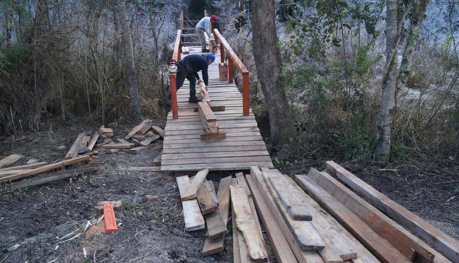 Personal contratado por la subsecretaría de Atención al Vecino, se encuentra realizando un puente pasarela de paso peatonal sobre un sector de mallín del Barrio Norte que dará el beneficio de poner en valor un espacio verde del barrio al cual se podrá acceder para realizar caminatas en familia.