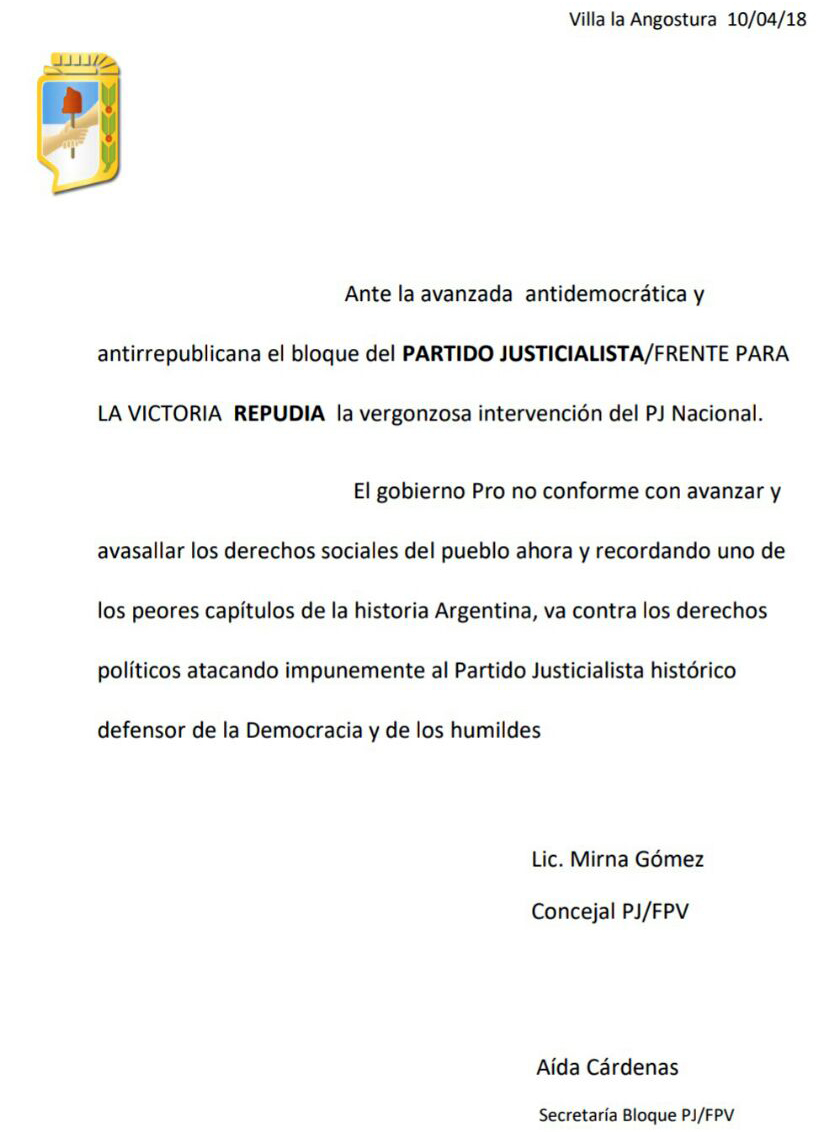 La concejal Mirna Gómez emitió un comunicado donde destaca que "va contra los derechos políticos atacando impunemente al Partido Justicialista". Comunicado textual.