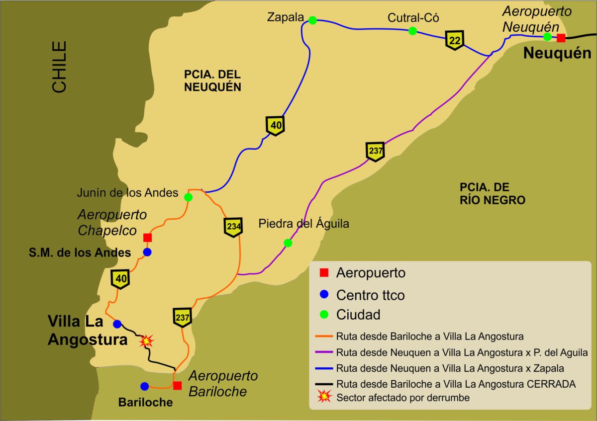 Debido a un desmoronamiento, la Ruta 40 en el km 2095, se encuentra interrumpida la circulación al tránsito. La ruta alternativa sería la Ruta 40 (Siete Lagos), hasta San Martín de los Andes.