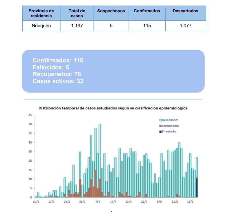 Además, se descartaron 14 casos sospechosos de la provincia del Neuquén. No se confirmaron nuevos casos.