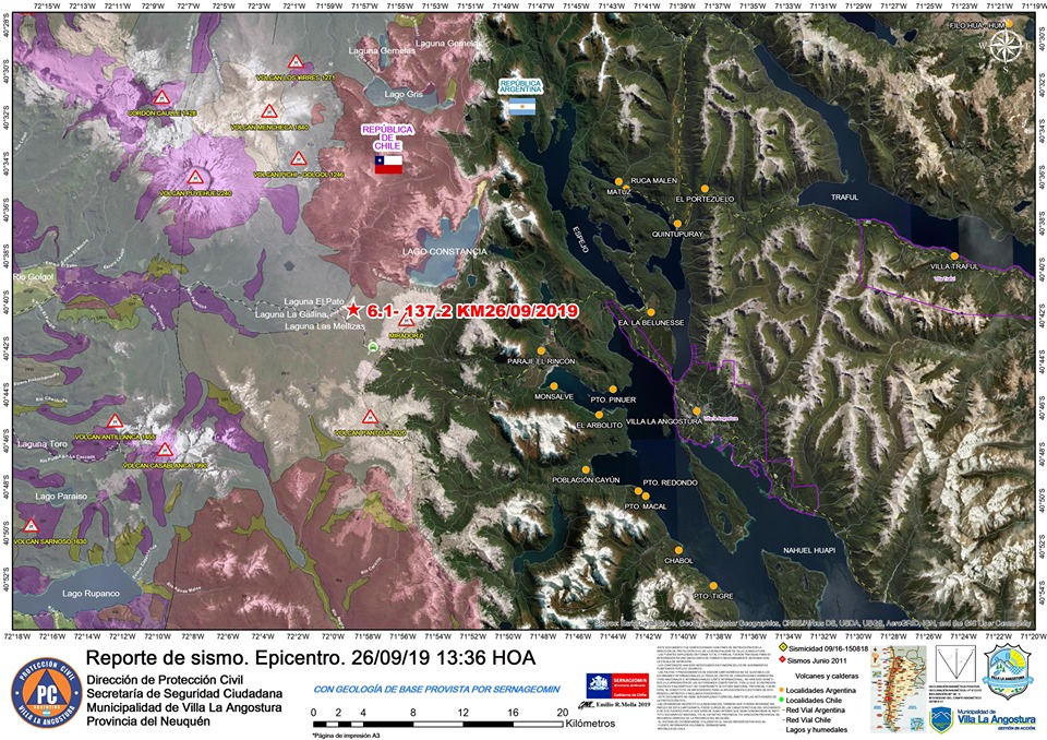 A las 13:36 hora argentina del día de hoy 26 de Septiembre de 2019, se registró un sismo ocurrido a 27 kilómetros de Villa La Angostura en dirección Oeste Noroeste. El mismo ocurrió una profundidad de 137 kilómetros por debajo de la corteza terrestre, con una magnitud de 6.1.
