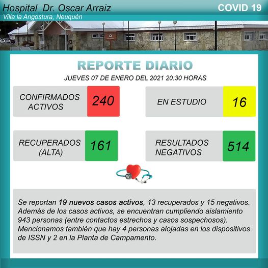 El hospital informó además que se encuentran en aislamiento obligatorio 943 personas, y que hay 6 personas contagiadas que están alojadas en dependencias del ISSN, hay 4 en estas instalaciones, y otras 2 en la Planta de Campamento, lugares que fueron preparados para alojar a pacientes que tienen Covid con un cuadro leve que no registra gravedad para el paciente.