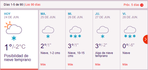 Así anticipa el pronóstico que favorece las expectativas ante la temporada invernal del turismo. La temperatura bajará hasta los 6 grados bajo cero, y habrá neviscas y nevadas hasta el viernes inclusive.