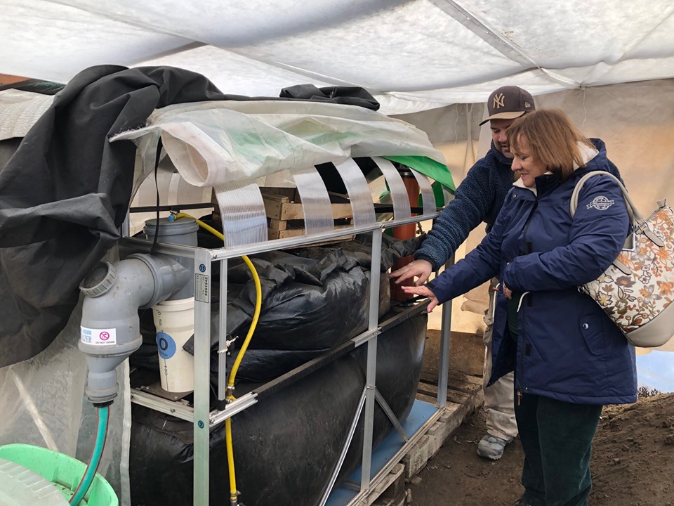 Renato e Ivana son artesanos y viven el El Portal, en una casa unida al propio taller donde elaboran sus artesanías. A metros de su hogar, montaron su invernadero junto con el biodigestor. En su visita, la Jefa Comunal presenció el funcionamiento de esta tecnología, que funciona como un contenedor cerrado donde los residuos del hogar, en forma líquida, son tratados, digeridos y fermentados, produciendo biogás -reutilizable como combustible- y abono fertilizante.