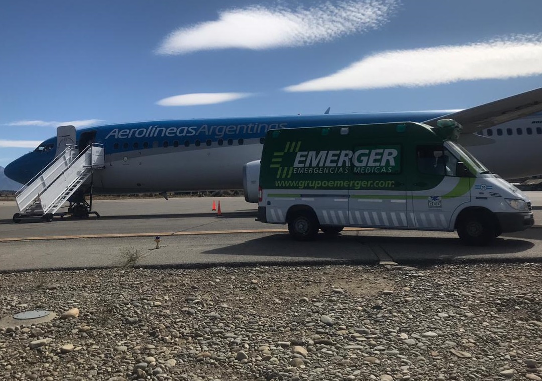 Un avión de la compañía Aerolíneas Argentinas que aterrizó en la ciudad no alcanzó a llegar a la manga del aeropuerto internacional de Bariloche esta tarde. Una ambulancia de la empresa Emerger se acercó hasta la aeronave y fue la encargada de trasladar a una mujer que venía desde Italia con síntomas sospechosos hasta el hospital Ramón Carrillo.