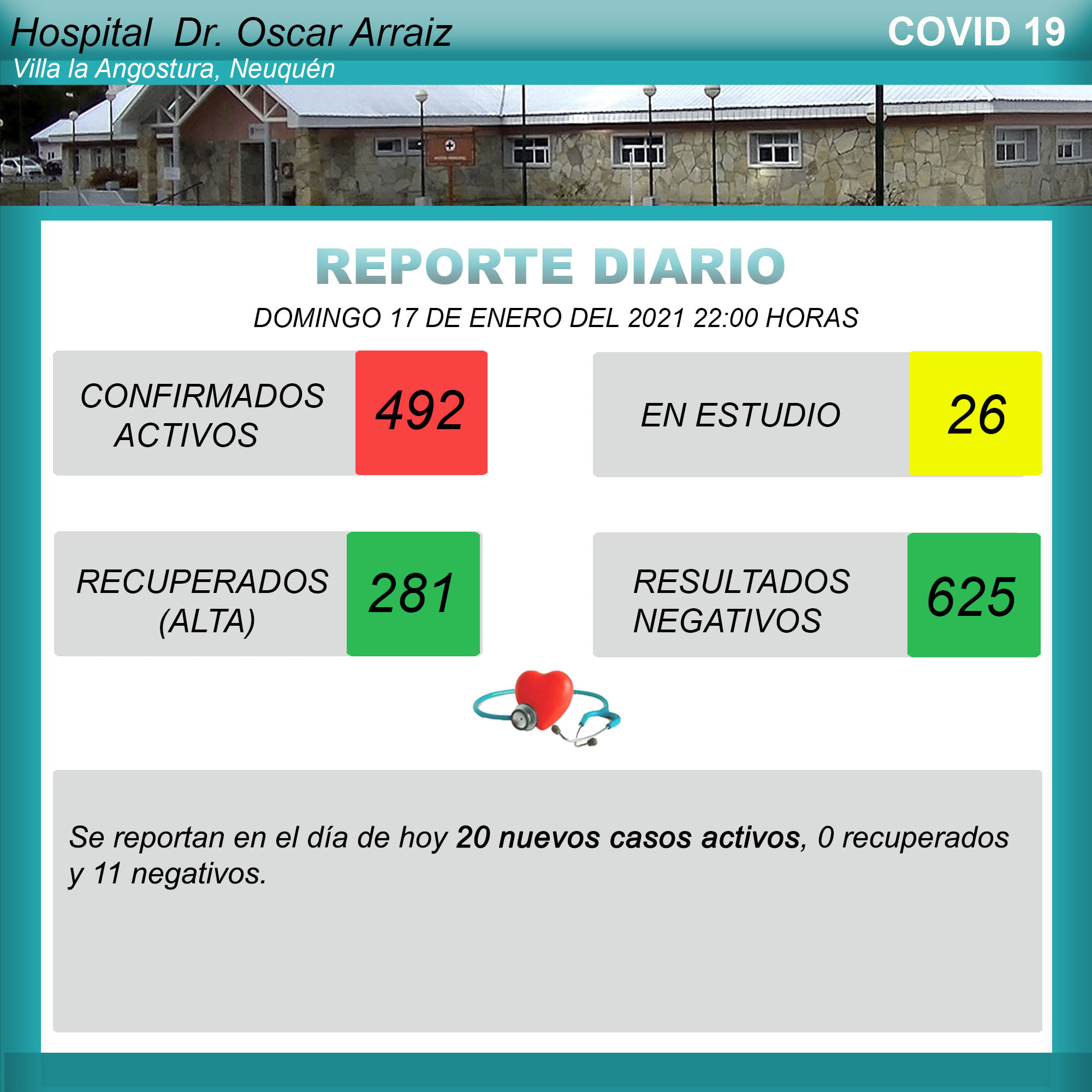 Este domingo por la noche el hospital local informó de 20 nuevos contagios, de esta manera se llegó a492 caos activos, mientras se espera por el resultado de otros 26 casos sospechosos.