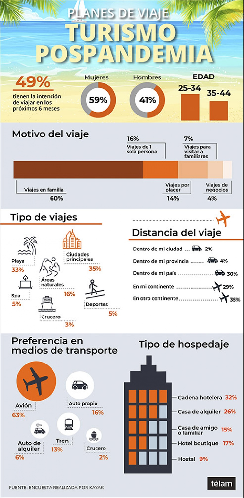 Una encuesta de Kayak en relación al Hot Sale sobre algo más de 2.000 usuarios de esa plataforma determinó que el 49% tiene intención de viajar en los próximos seis meses, que el 60% de ellos lo hará en familia, el 16% solo, el 7% para visitar familiares, el 14% por placer y el 4% por negocios.