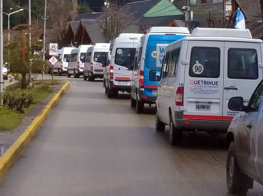 Los manifestantes formaron una extensa caravana de vehículos que se desplazó antes del mediodía por la céntrica avenida Arrayanes de Villa La Angostura.