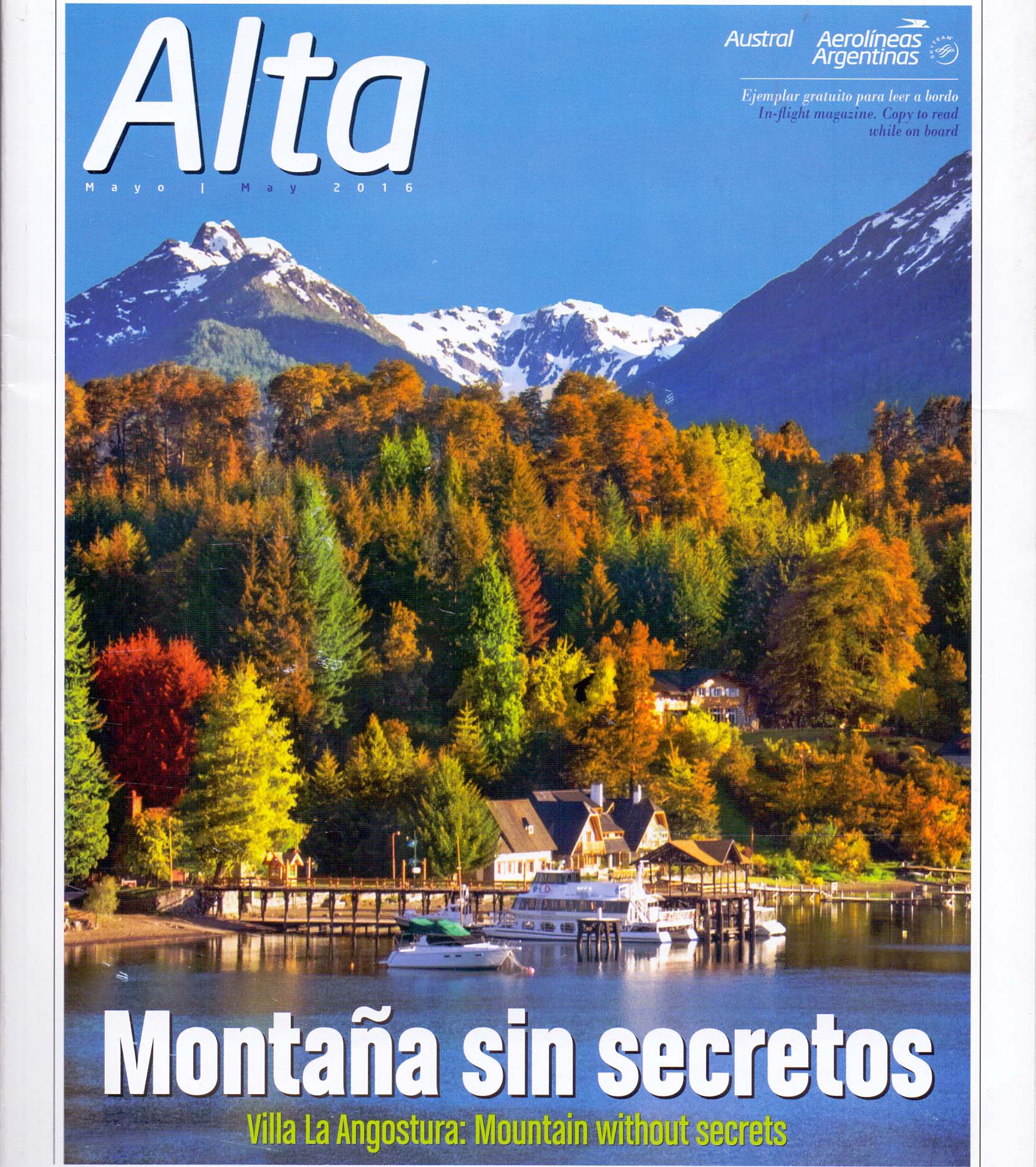La edición del mes de mayo de la revista Alta, tiene como nota de tapa a Villa La Angostura. La revista está en todos los asientos de los vuelos de cabotaje de la empresa aérea, lo que implica que alrededor de 800.000 pasajeros la tendrán en sus manos a lo largo del mes.