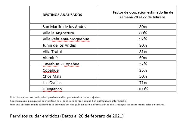 Tanto San Martín de los Andes, Junín de los Andes; Villa Traful y Villa la Angostura cerraron el fin de semana con una ocupación del 80 %, mientras que Villa Pehuenia – Moquehue, sigue siendo uno de los destinos con mejor promedio de ocupación, cerrando esta semana con un 92 % de las habitaciones ocupadas.