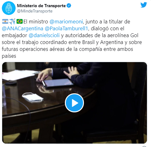 La empresa aérea brasileña Gol le comunicó al ministro de Transporte, Mario Meoni, su intención de retomar las operaciones hacia y desde la Argentina, e incluso expresó su decisión de ampliar las frecuencias que ya tenían, informaron hoy fuentes de la cartera de Transporte.